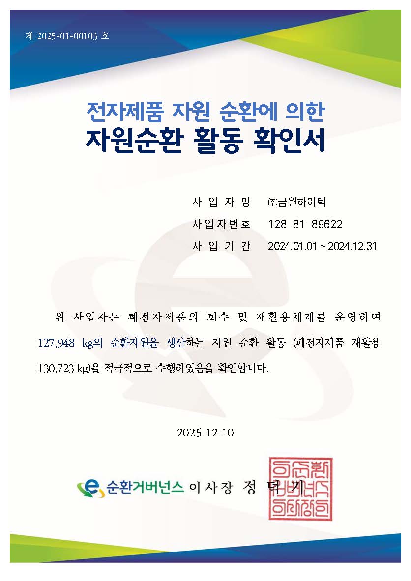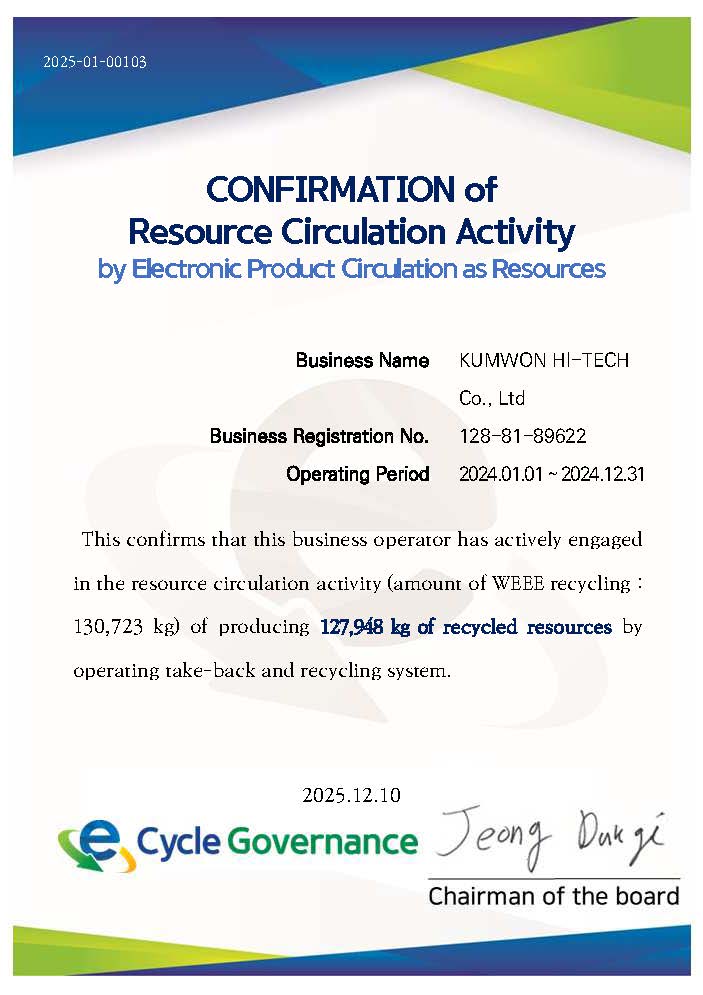 전기·전자제품 회수·재활용에 의한 ESG 성과 확인서(순환자원 생산 확인서)