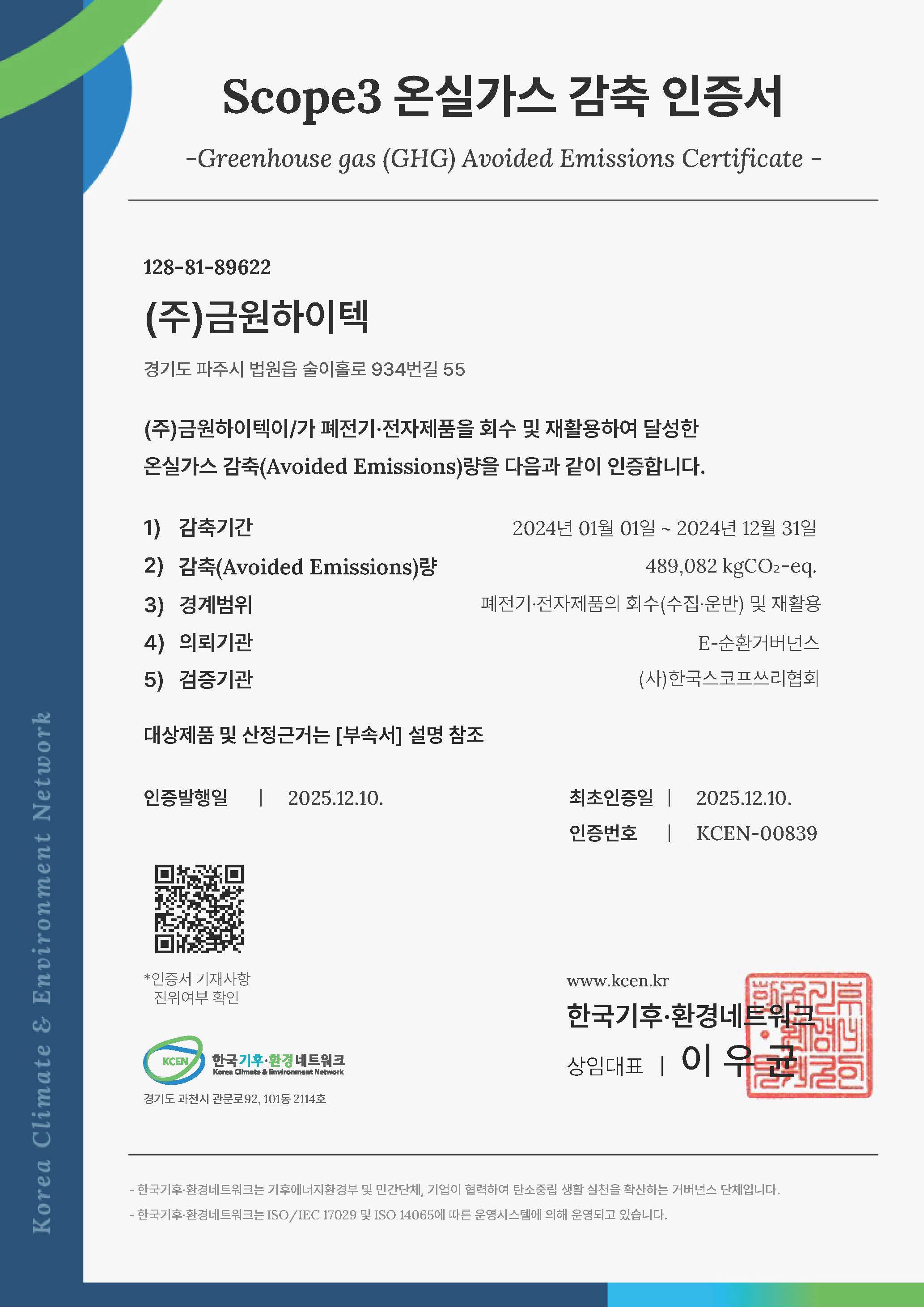 전기·전자제품 회수·재활용에 의한 ESG 성과 인증(온실가스 감축 인증서)